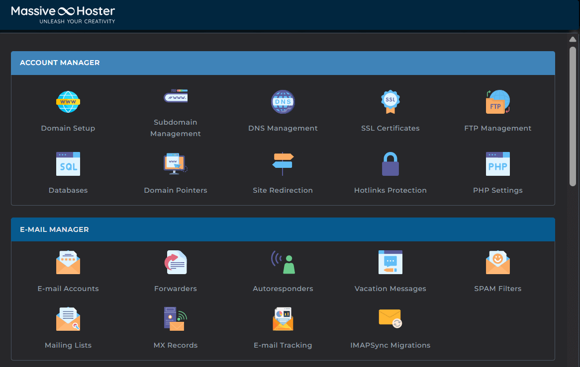 Dans votre interface d'hébergement MassiveHoster sont inclus de nombreux outils premium tels que, entre autres :
